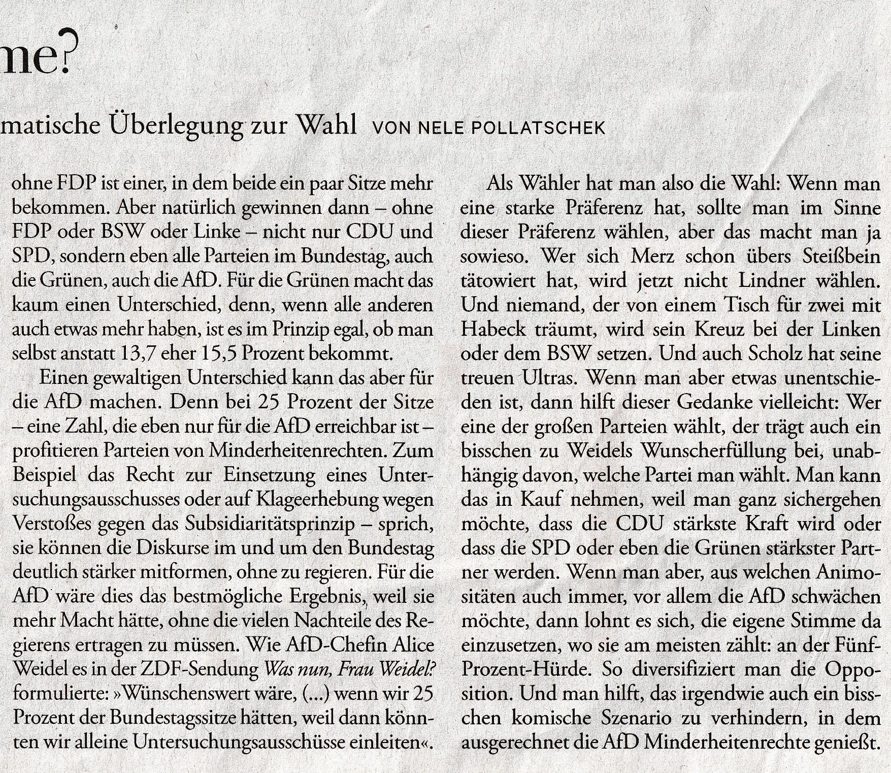 Sagen Sie nicht, ich wähle sowieso, was in der ZEIT stand. Ich hatte den Politikteil längst hinter mir, und dann war es im Feuilleton genau dieser Argumentationsgang von Nele Pollatschek, der mir gefallen hat. Und erst nachher las ich – ebenfalls mit Zustimmung – in Wikipedia, was sie z.B. übers Gendern meint: hier.
